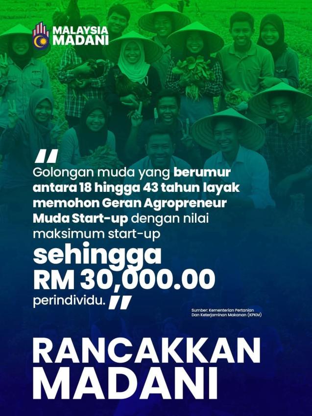 Golongan muda berumur 18 hingga 43 tahun layak memohon Geran Agropreneur Muda Start-up, iaitu satu inisiatif kerajaan bagi menyokong penglibatan anak muda dalam sektor agromakanan. Geran ini diberikan dalam bentuk barangan dengan nilai maksimum sehingga RM30,000 per individu.